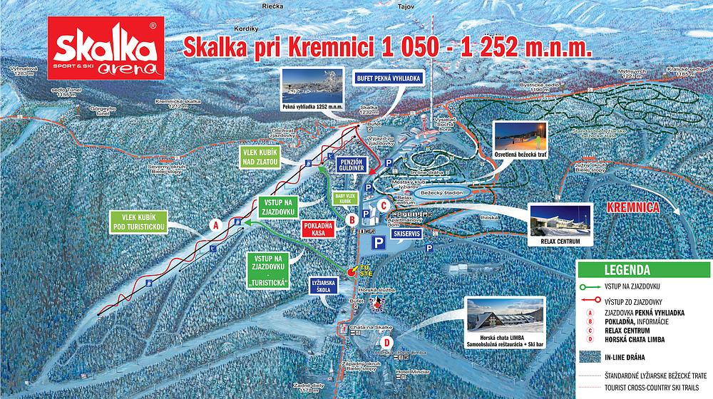 Skalka is a ski resort located in the Kremnica Mountains of Slovakia, near the town of Kremnica. It offers 5.6 km of downhill skiing slopes, including 4.8 km with artificial snow, as well as cross-country skiing opportunities. The resort has a four-seater chairlift, four ski-tows, and a sports center with accommodation options. Skalka is suitable for all levels of skiers and snowboarders, with a compact ski area and a variety of terrain.