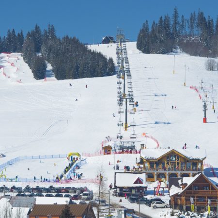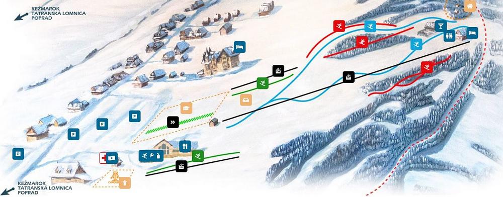 Ski Centrum Strachan is a ski resort located in the Belianske Tatra Mountains, Slovakia. It offers a range of facilities, including a ski school, rentals, restaurant, and bar on the slope. The resort has 3 ski lifts with a total capacity of 1610 persons per hour, and 3.8 km of slopes suitable for beginner and intermediate skiers. The highest point of the resort is at an altitude of 965 m asl. It's an ideal destination for families with kids, with a dedicated children's area and activities like skiing, snowboarding, and sledding.