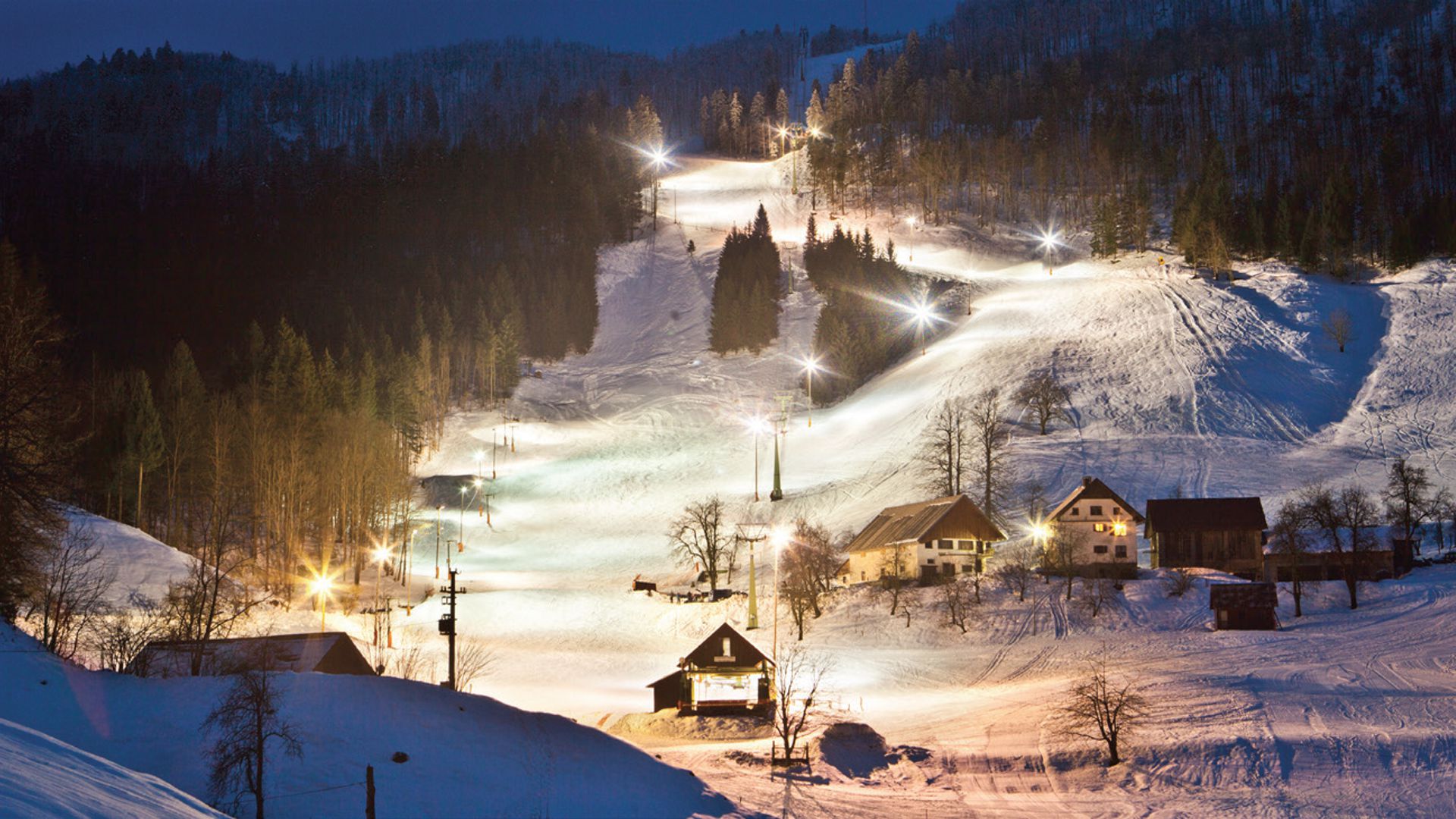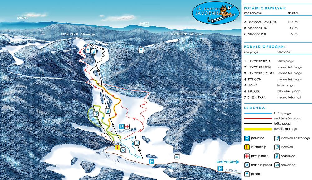 Javornik is a small ski resort located in the Goriška region of Slovenia, about 55 kilometers southwest of Ljubljana. It offers 7 kilometers of slopes and is situated near the town of Idrija. The resort is relatively new and has a high elevation, with a panoramic tower offering stunning views of the surrounding mountains. However, it appears to be temporarily closed.