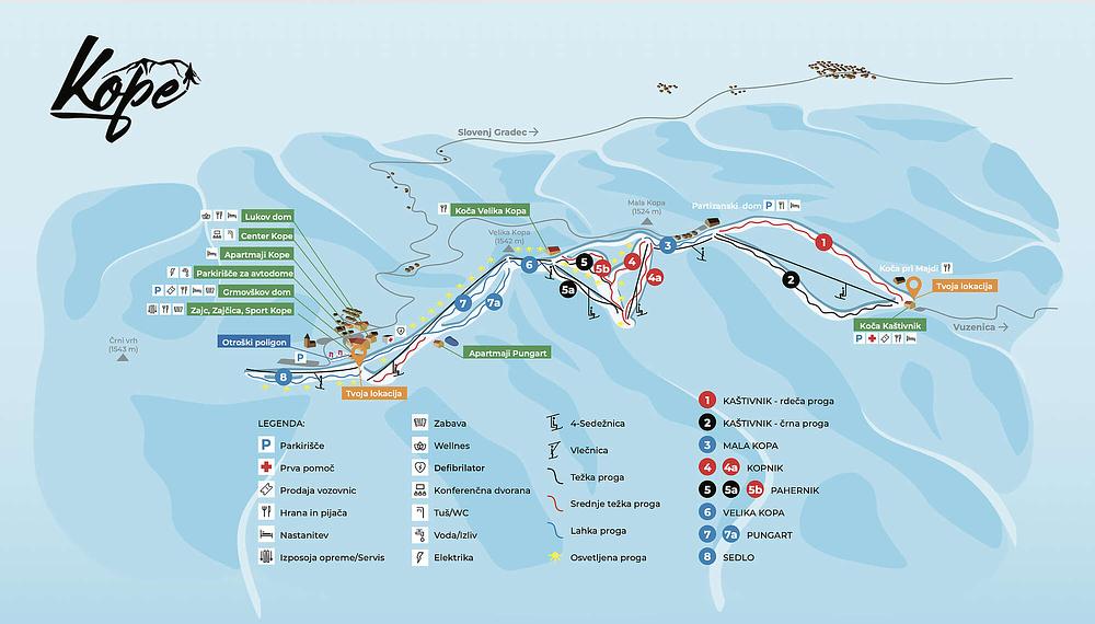 Kope ski resort in Slovenia offers a range of slopes for skiing and snowboarding, with 8 km of prepared ski runs and 4 km of cross-country skiing trails. The resort has a skiable area of 194 acres and features 7 trails, with a total lift capacity of 12,014 passengers per hour. It's a popular destination for families, with simple accommodation options and bike trails available in the summer. The resort is located in the western part of the Pohorje mountain range, near the town of Slovenj Gradec.
