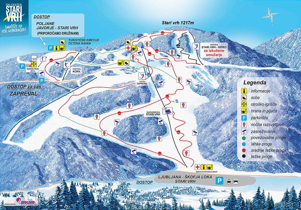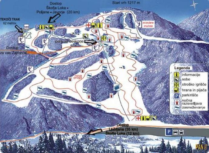 Here's a summary of Stari Vrh in 50-100 words: Stari Vrh is a family-friendly ski resort in Slovenia, located about 20 km from Škofja Loka and near Ljubljana. It boasts 12 km of ski slopes, suitable for all skill levels, and offers a range of activities, including night skiing and sledding. The resort has a vertical drop of 636 meters and a top elevation of 1,216 meters. Visitors can also enjoy the Družinski park Stari Vrh, a family adventure park with climbing walls, zip lines, and more. The resort offers equipment rental, ski school, and a pub and boarding house on site.