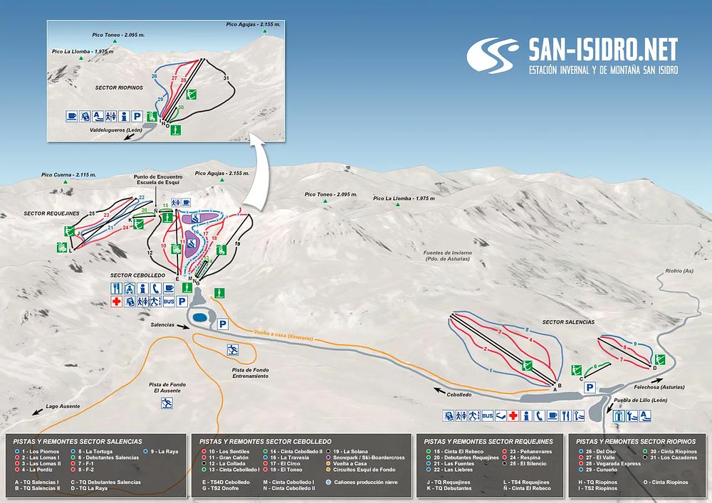 Estación Invernal y de Montaña San Isidro (Sector Cebolledo y Requejines) is a ski resort located in the Cantabrian mountain range in Spain. It offers 20.8 km of slopes and 3.5 km of ski routes, with 7 lifts transporting guests. The resort has a range of facilities, including parking, schools, cafes, and restaurants, and is suitable for both experienced and beginner skiers. The area is known for its stunning natural backdrop and attracts thousands of visitors each year.