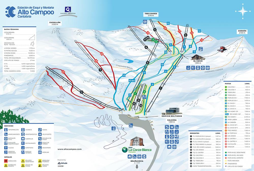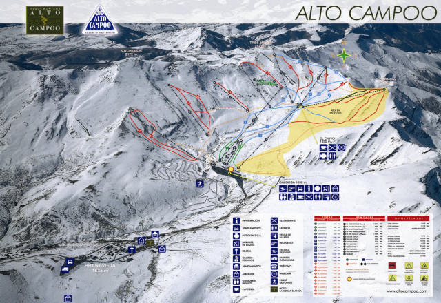 Alto Campoo is a ski resort located in the Cantabrian Mountains of northern Spain, in the comarca of Campoo. It offers 28km of slopes, with 2.25km of green runs, 13.5km of blue runs, and 12.25km of red runs, catering to various skill levels. The resort has a base elevation of 1,650 meters and features 5 chair lifts and 8 ski tows. It's a medium-sized year-round center with amenities like restaurants, ski rental, and a swimming pool. The resort is situated near the town of Hermandad de Campoo de Suso and is accessible from Reinosa, with a variety of accommodation options available nearby.