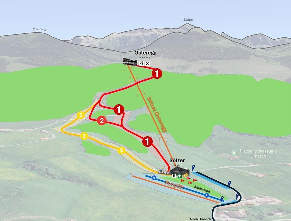 Urnäsch - Osteregg is a family-friendly ski resort in the Appenzell Ausserrhoden region of Switzerland. The resort offers gentle slopes and a T-bar lift, making it suitable for beginners and families. The ski area has a total of 2 km of pistes, with one lift and a practice lift available. The Bergrestaurant Osteregg offers a cozy atmosphere and stunning views. The resort is easily accessible and offers a range of accommodation options, including the Ferienhaus Osteregg "Hüsli" chalet.