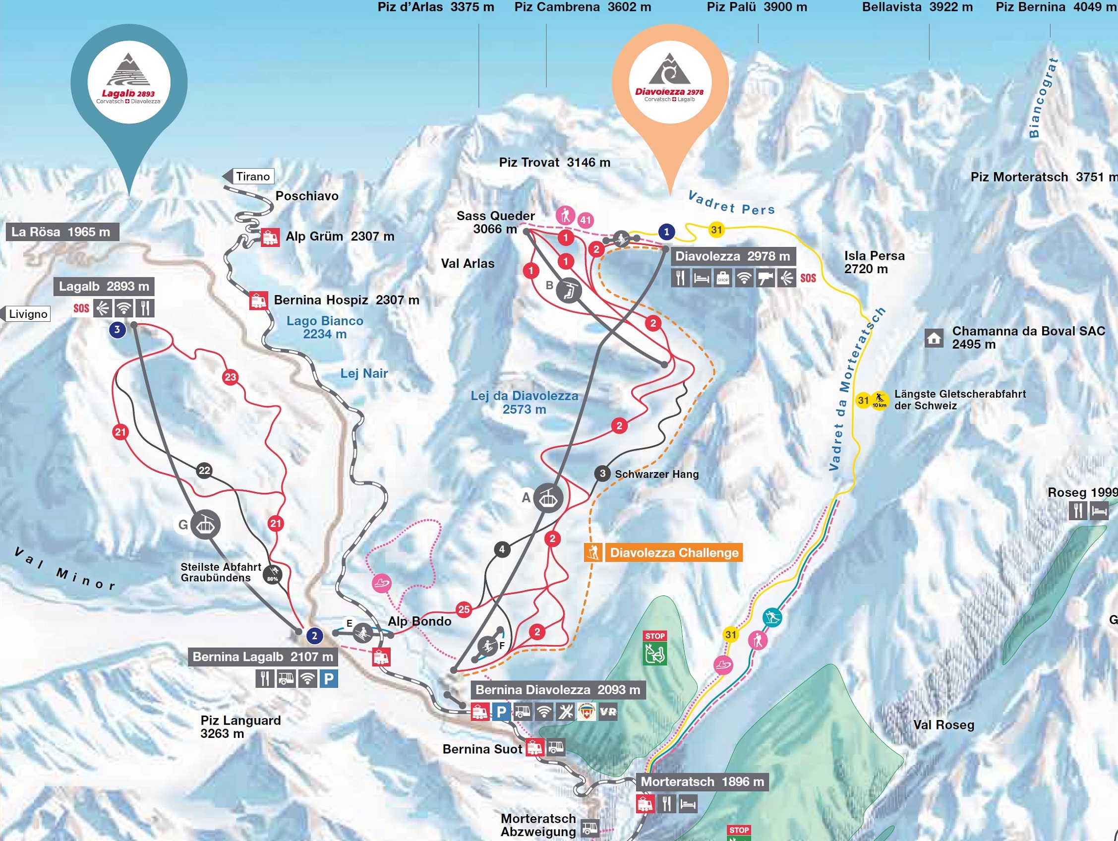 Diavolezza-Lagalb is a ski resort in Pontresina, Switzerland, nestled in the Val Bernina region. It boasts a vertical descent of 915 meters and 5 ski lifts, catering to advanced skiers and snowboarders seeking off-piste adventures. The resort offers stunning mountain scenery, glaciers, and a variety of hiking and skiing options. With a 4.7-star rating from 947 reviews, Diavolezza-Lagalb is a hidden gem for those seeking a unique and challenging skiing experience.
