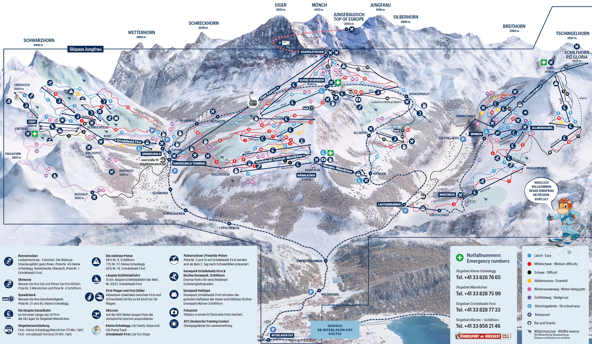 Grindelwald First is a popular ski resort in the Swiss Alps, offering 56 kilometers of pistes and 40 kilometers of hiking and tobogganing trails. The resort is accessible by gondola cableway and features a range of slopes and snowparks for both beginners and experts. In the summer, it offers adventure activities like the First Flyer, First Glider, and mountain cart. The resort is part of the larger Jungfrau Region, which includes three ski areas and over 200 kilometers of slopes.