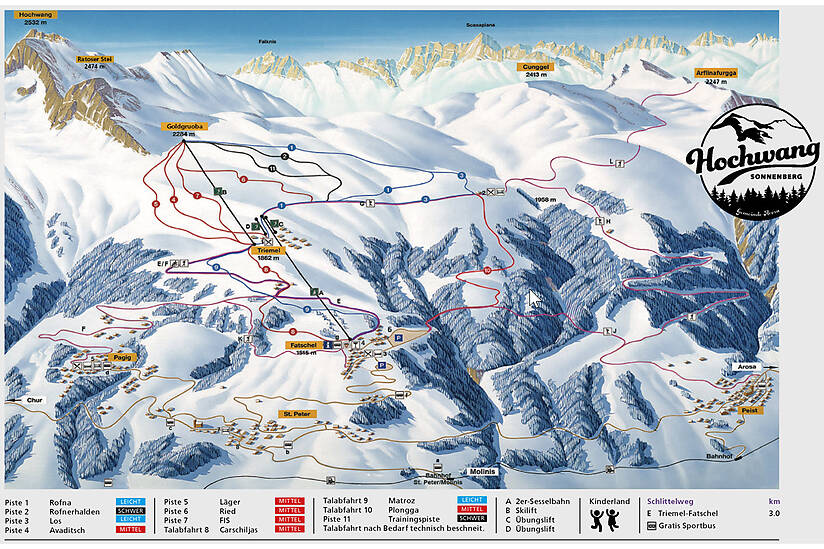Hochwang is a ski resort located in the Arosa Holiday Region of Switzerland, offering 20 km of slopes at 1,542 meters above sea level. It's described as a natural and unassuming resort, ideal for those seeking a more relaxed skiing experience. The resort is surrounded by stunning mountain scenery and offers limitless winter sports opportunities. With a 4.2-star rating on Bergfex and 4.6-star rating on Google, Hochwang is a hidden gem for those looking for a peaceful skiing experience.