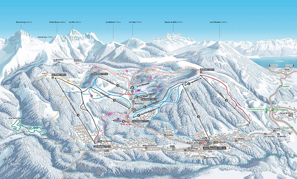Les Paccots is a family-friendly ski resort located in the Fribourg Pre-Alps, Switzerland, about 15 minutes from Vevey and 30 minutes from Fribourg. The resort features 11 ski lifts, including 3 for children, and offers a variety of slopes suitable for all skill levels. Les Paccots has a base elevation of 1,060 meters and a summit elevation of 1,568 meters, with a vertical drop of 433 meters. The resort is open from mid-December to mid-April and is known for its accessible and gentle slopes, making it an ideal destination for families and beginners.