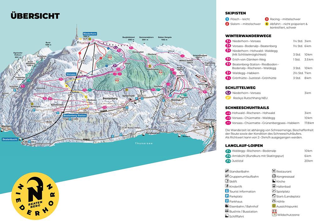 Niederhorn is a mountain peak in the Bernese Oberland region of Switzerland, offering breathtaking views of Lake Thun and the surrounding Alps. In winter, it's a popular ski resort with challenging downhill runs and pleasure pistes for all levels. In summer, it's a favorite among hikers and nature lovers, with easy access from Thun and Interlaken. The mountain offers a unique backdrop for outdoor activities, including skiing, snowboarding, and hiking, with a variety of trails and scenic views to enjoy.