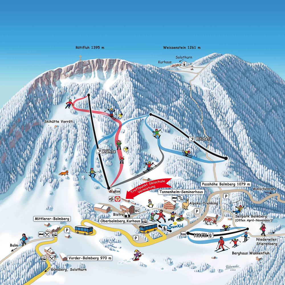 Oberbalmberg is a ski resort located in Balm bei Günsberg, Switzerland. It offers a family-friendly skiing experience with three lifts and five kilometers of pistes. The resort has a total of 2.3 out of 5 stars on review platforms, indicating a decent but not exceptional skiing experience. The resort is easily accessible from the village center, which is just 3.2 kilometers away.