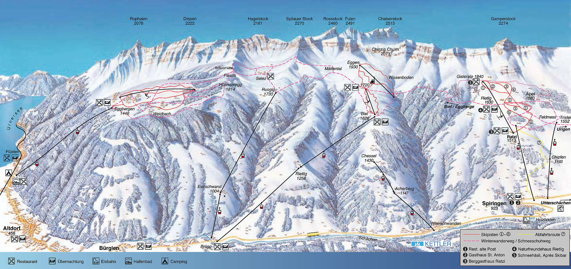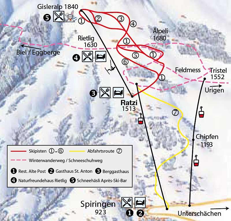 Ratzi ski resort in Spiringen, Switzerland offers 6 groomed slopes with a total length of 5 km, including a 3 km long longest run. The resort has 2 lifts and is situated at an altitude of 890m. It's a great destination for skiing, snowboarding, and winter hiking, with opportunities for snowshoeing and exploring the snow-covered landscape.