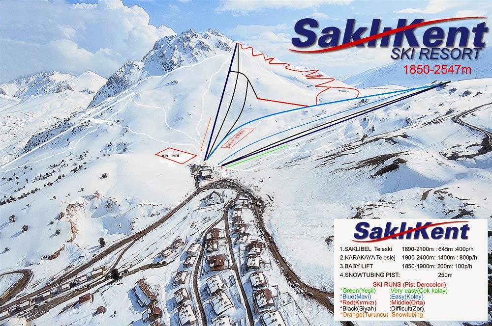 Saklıkent is a winter resort in Turkey, located 45 kilometers from Antalya and 60 kilometers from Antalya Airport. It offers skiing and snowboarding opportunities on 10 kilometers of slopes, with a two-seater chairlift and a T-bar ski lift. The resort is situated at an altitude of up to 2,500 meters and is known for its mild temperatures. It is open for skiing from November to May.
