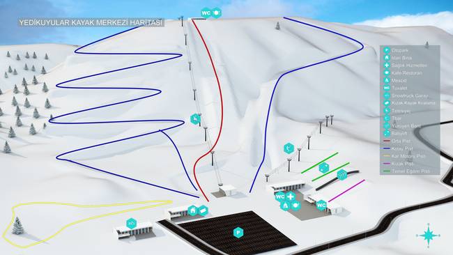 Yedikuyular Ski Resort is a ski resort located in Dulkadiroğlu, Turkey, at an elevation of 2,300 meters. It offers 3 ski trails of varying difficulty, chair lifts, and a cafe. The resort is situated near the city of Kahramanmaraş and is a straightforward, alpine-style resort.