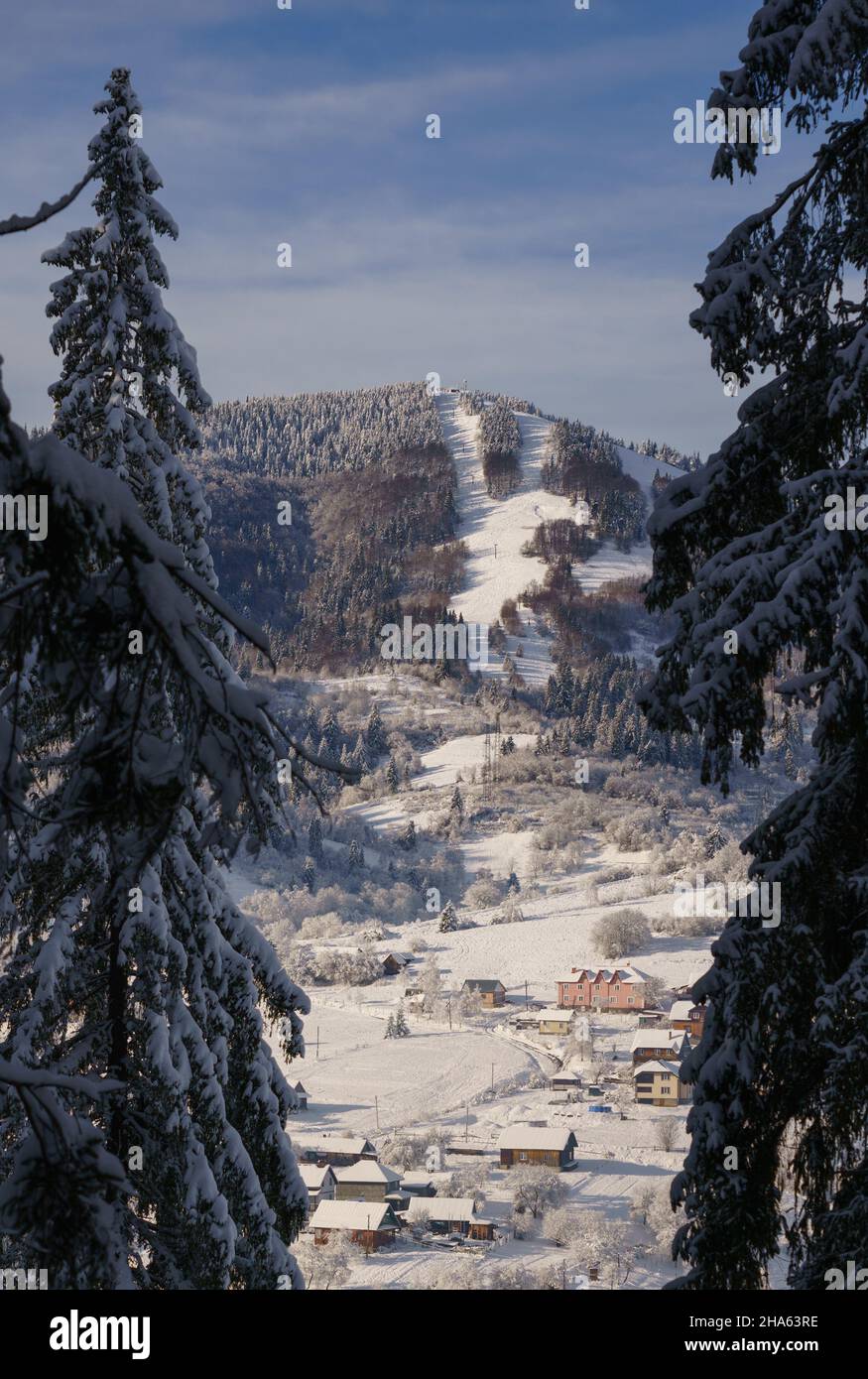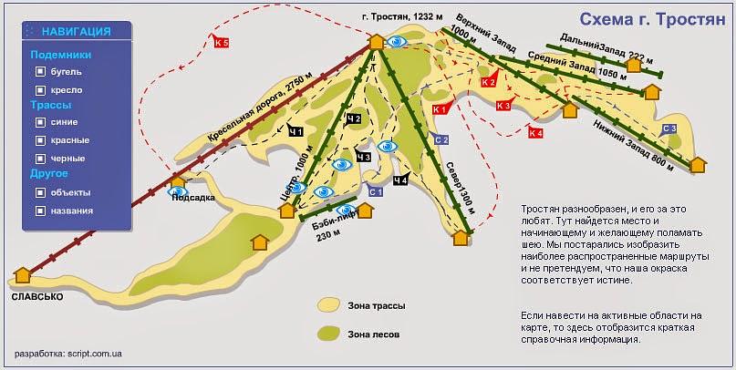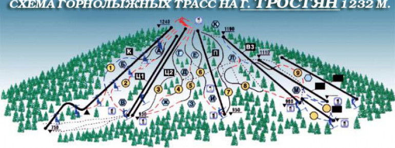 Slavske - Trostyan is a ski resort located in the Lviv Oblast, Ukraine. It offers 12 km of slopes and 8 lifts, including a single chairlift. The resort is situated at an altitude of 1232 meters and is surrounded by forested hills, scenic mountain lakes, and fast-flowing rivers. The area is known for its unpredictable weather and diverse fauna. The resort is a popular destination for skiing and snowboarding, with a range of slopes for different skill levels.