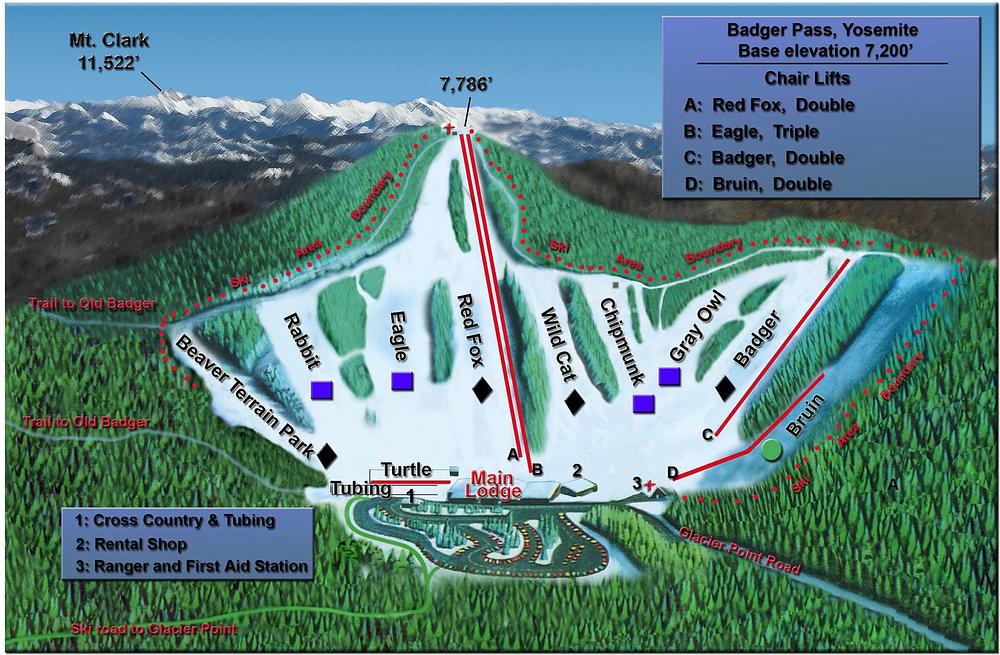 Badger Pass Ski Area is a small, family-friendly ski resort located within Yosemite National Park in California. With 10 slope runs of varying difficulty and five lifts, it's ideal for beginner skiers and snowboarders. The ski area boasts 88 acres of groomed terrain, including downhill skiing, snowboarding, cross-country skiing, and tubing. Established in 1935, it's California's oldest operating ski area, offering a casual atmosphere and non-intimidating slopes.