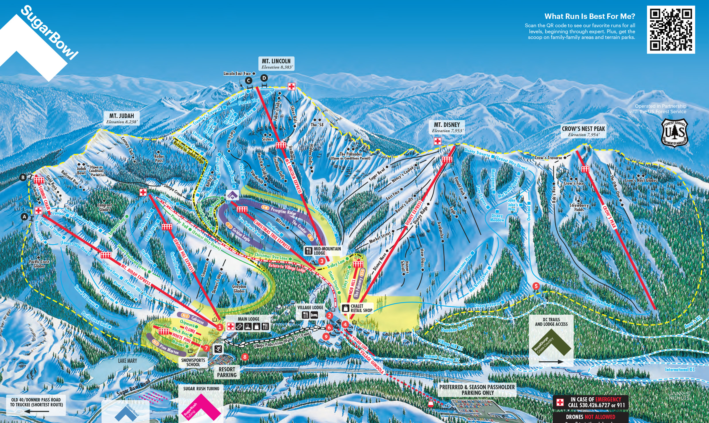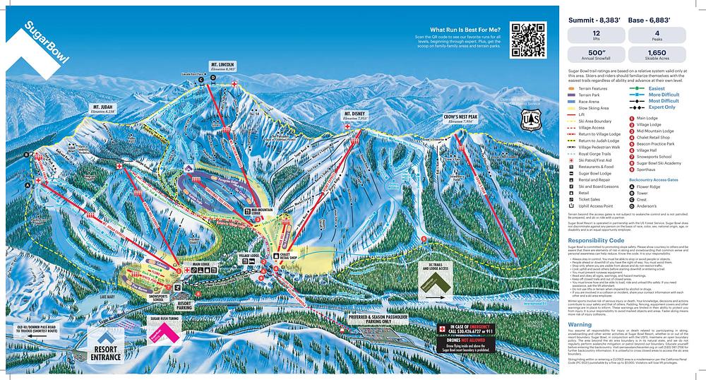 Sugar Bowl Resort is a family-owned and operated ski resort in Norden, California, near the Donner Pass of the Sierra Nevada mountain range. With 1500 acres of skiable terrain and 500 inches of annual snowfall, it offers a range of trails for beginners and experts alike, serviced by 13 lifts. The resort has a rich history, with ties to Austrian ski culture, Hollywood, and Walt Disney. It features a variety of amenities, including rentals, classes, and a hotel, and is known for its friendly staff and family-friendly atmosphere.