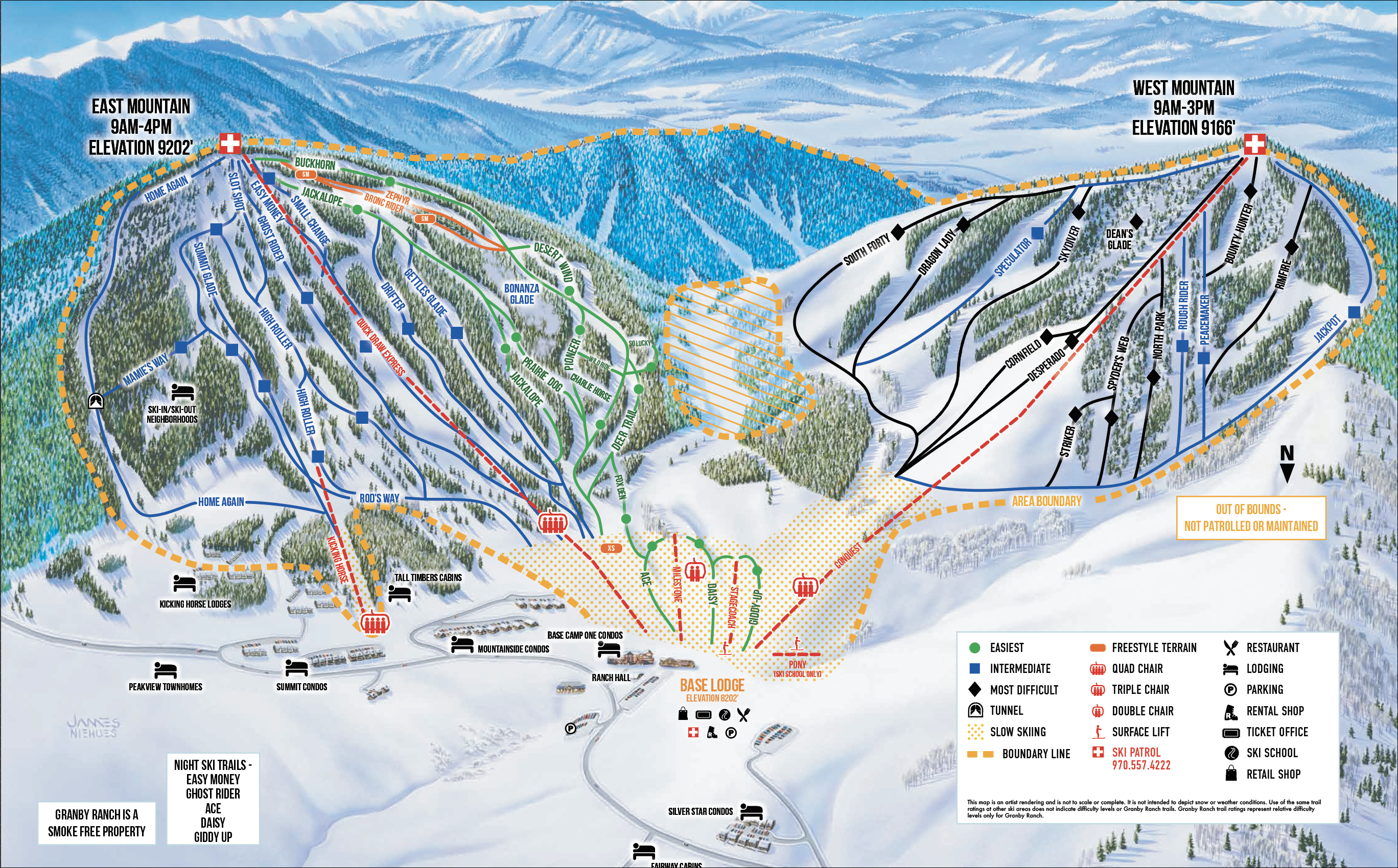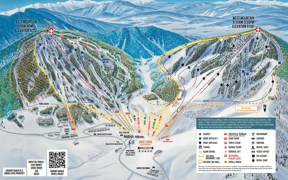 Here's a 50-100 word summary of Ski Granby Ranch: Located 90 minutes west of Denver, Colorado, Granby Ranch is a family-friendly ski resort with 41 trails, 6 terrain parks, and 900 acres of skiable terrain across two mountains. The resort offers a range of activities, including skiing, snowboarding, and mountain biking in the summer. With nearly 1,000 feet of vertical and an annual snowfall of over 85 inches, Granby Ranch provides an intimate Colorado ski experience with stunning views. The resort features a ski school, rentals, and a lodge with a restaurant, making it an ideal destination for families and beginners.
