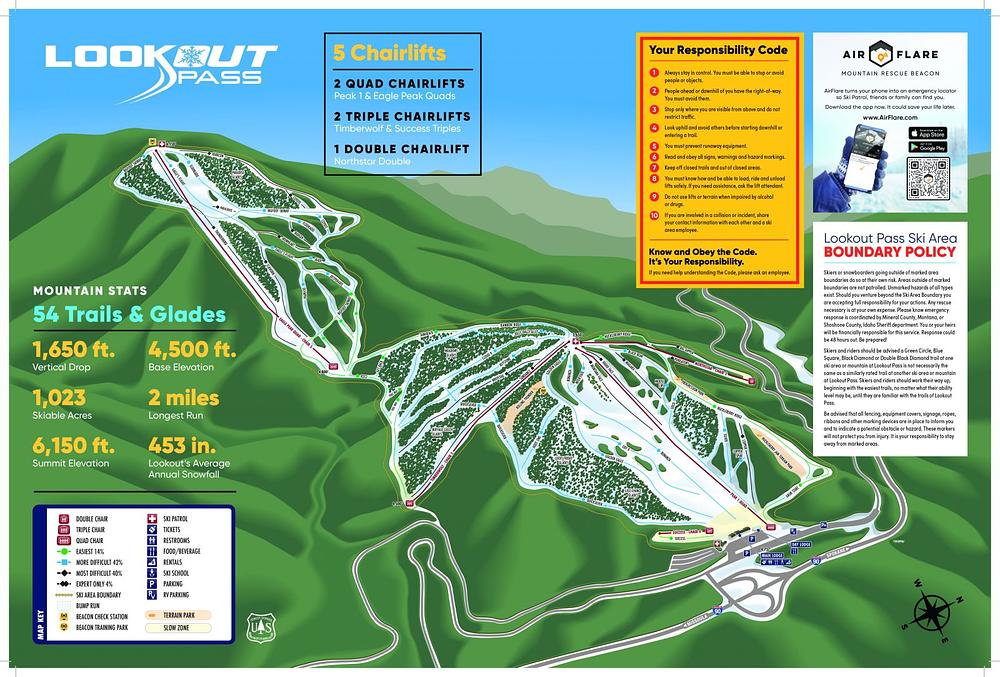 Lookout Pass is a ski resort located on the Idaho-Montana border, offering 34 trails and 1,023 acres of skiable terrain. With a vertical drop of 1,650 feet, it's a great destination for skiers and snowboarders of all levels. The resort boasts an average annual snowfall of over 400 inches, making it one of the snowiest areas in the region. Lookout Pass is known for its family-friendly atmosphere, with free kids' lessons and a variety of amenities, including a restaurant and scenic bike trail.