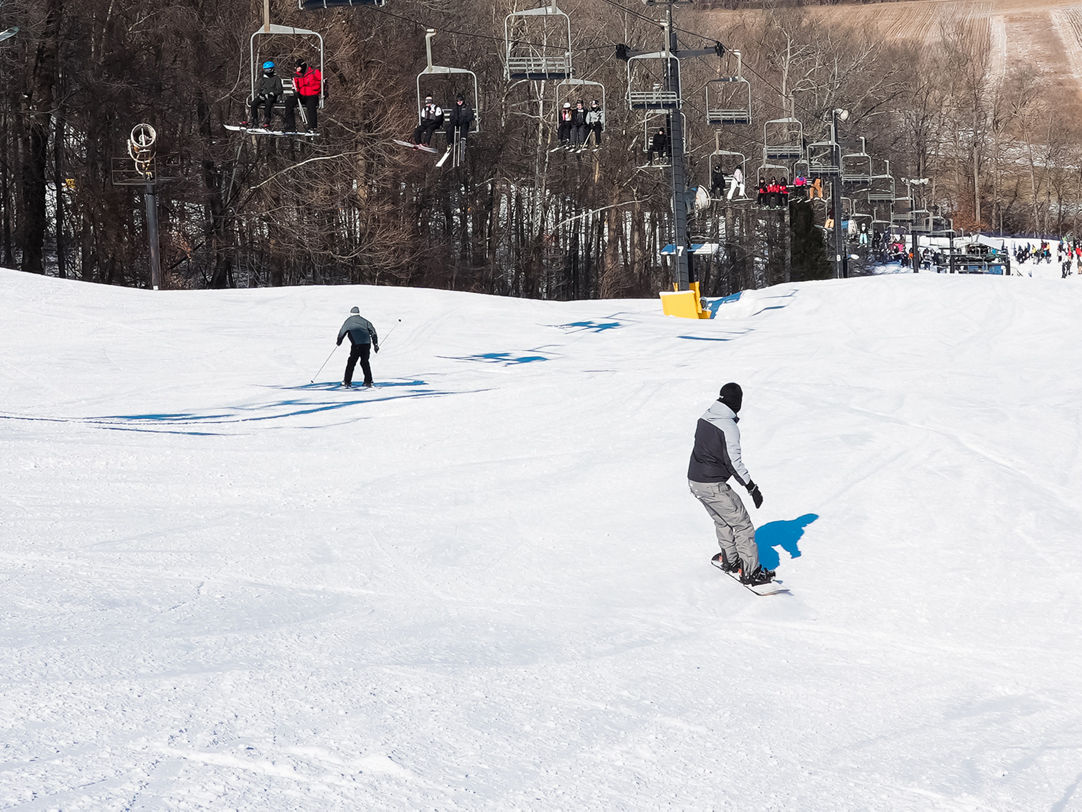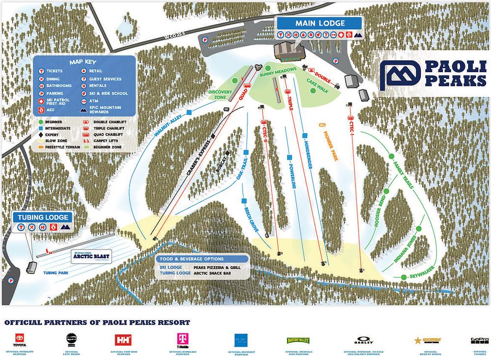 Paoli Peaks is a ski resort located in Paoli Township, Orange County, Indiana. It offers 65 acres of skiable terrain with 15 trails, five chairlifts, and three surface lifts. The resort has a vertical drop of 300 feet and is suitable for skiers, snowboarders, snowbladers, and tubers. Paoli Peaks has a natural hill with an elevation of 900 feet and a snowmaking system that allows for 12 inches of snow to be made in one night. The resort is open seasonally and has a beginner's area, two terrain parks, and a snow-tubing hill.
