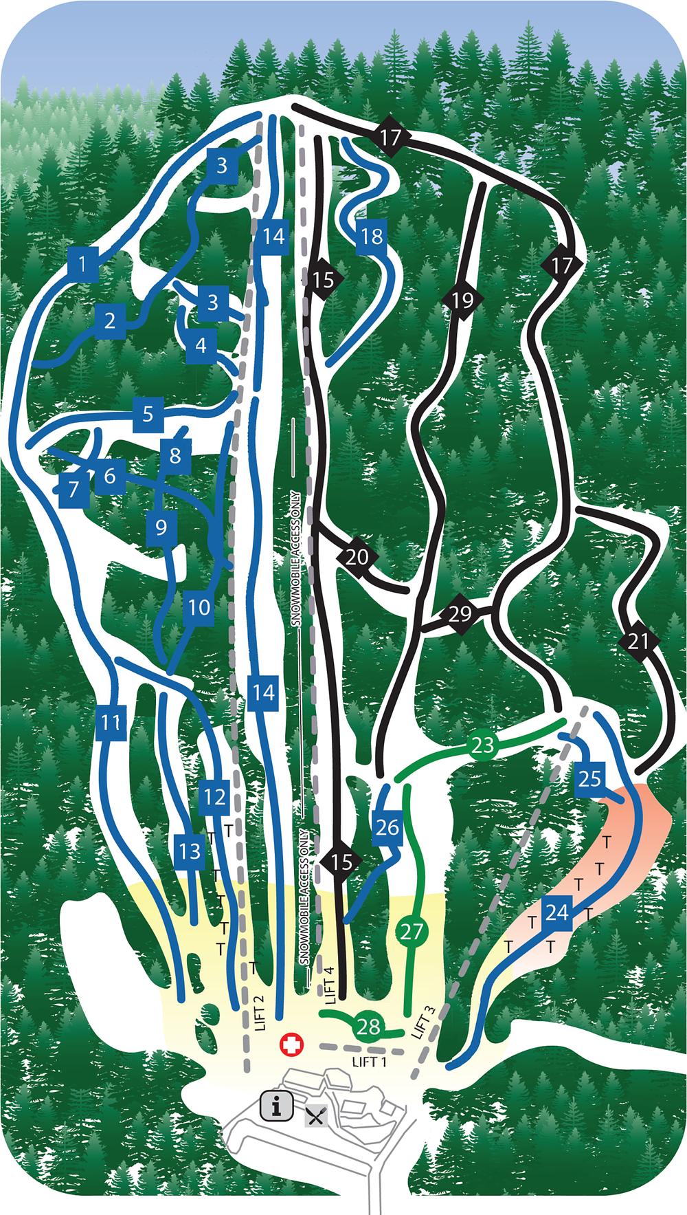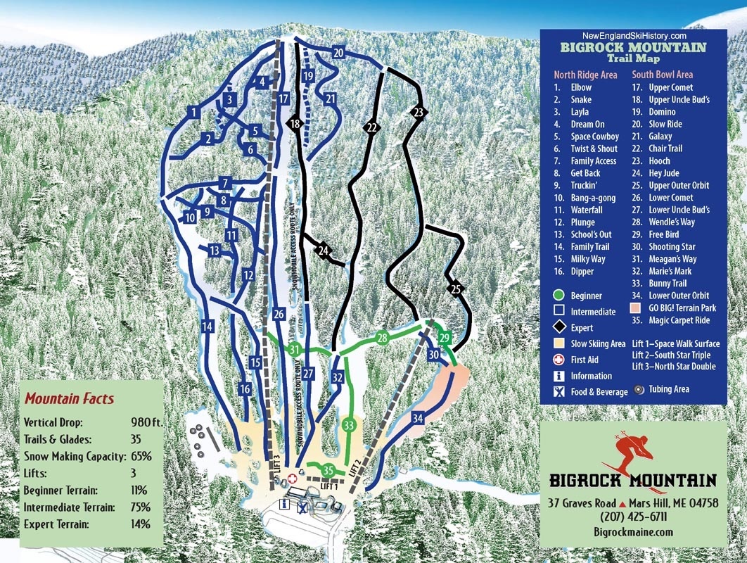 Big Rock Mountain is a ski resort located in Mars Hill, Maine, on the western face of Mars Hill. It boasts 2 chairlifts, 26 trails, 80% snowmaking, night skiing, and almost 1000 ft of continuous vertical drop, making it one of the larger ski resorts in Maine. The resort offers a diverse terrain with multiple fall lines and trails for all skill levels, from beginners to experts. It also features a snow-tubing park and equipment rentals, with a focus on community skiing as a 501(c)3 non-profit organization.