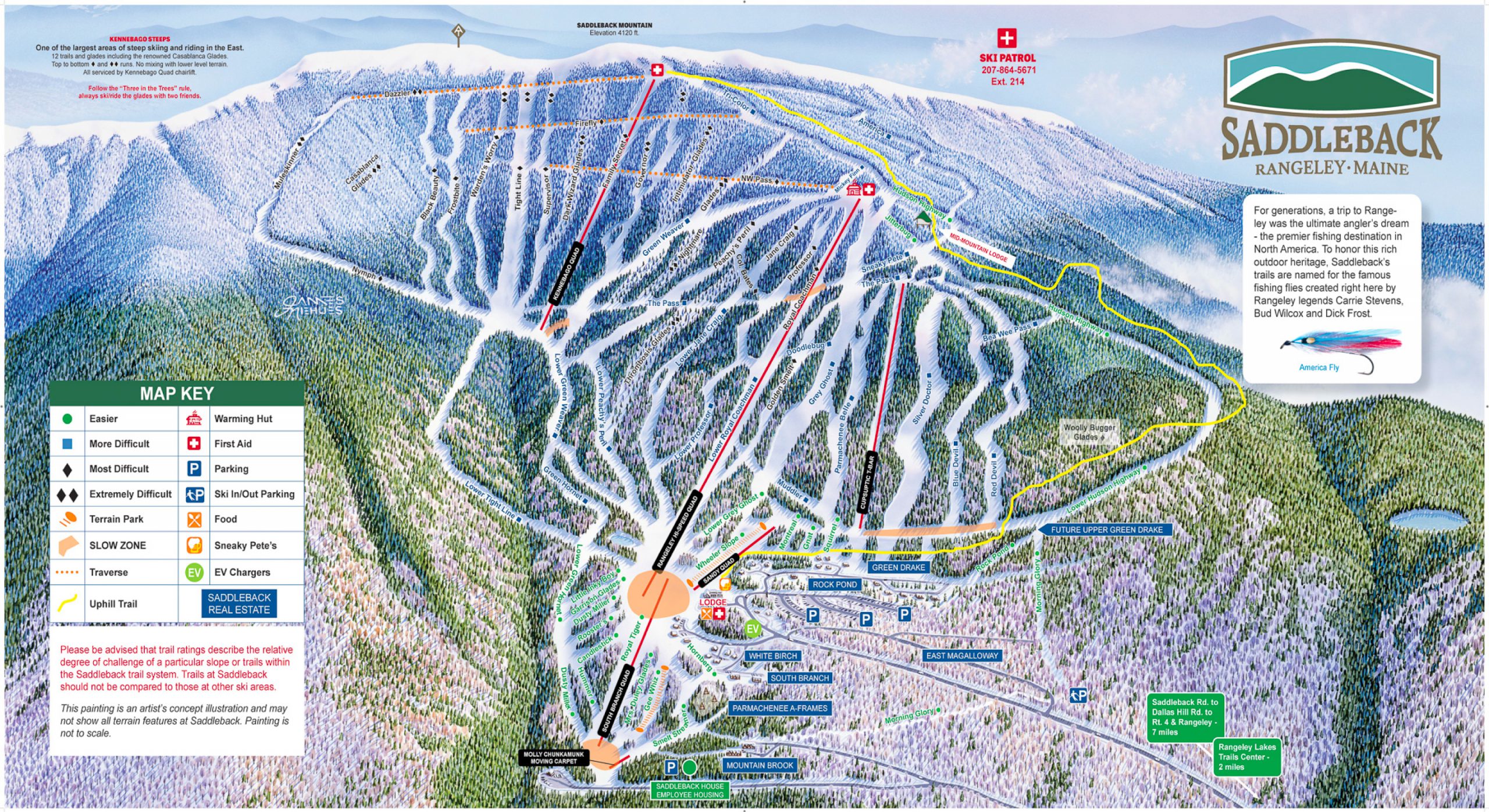 Saddleback Ski Area in Rangeley, Maine, is a 4.7-star rated ski resort with 68 trails, 600 skiable acres, and a 2,000-foot vertical drop. It features a mix of gentle slopes and challenging terrain, making it suitable for skiers and riders of all levels. The resort offers a variety of amenities, including a big lodge, restaurants, and live music. With an annual snowfall of 225 inches, Saddleback is a popular destination for winter sports enthusiasts and nature lovers alike.