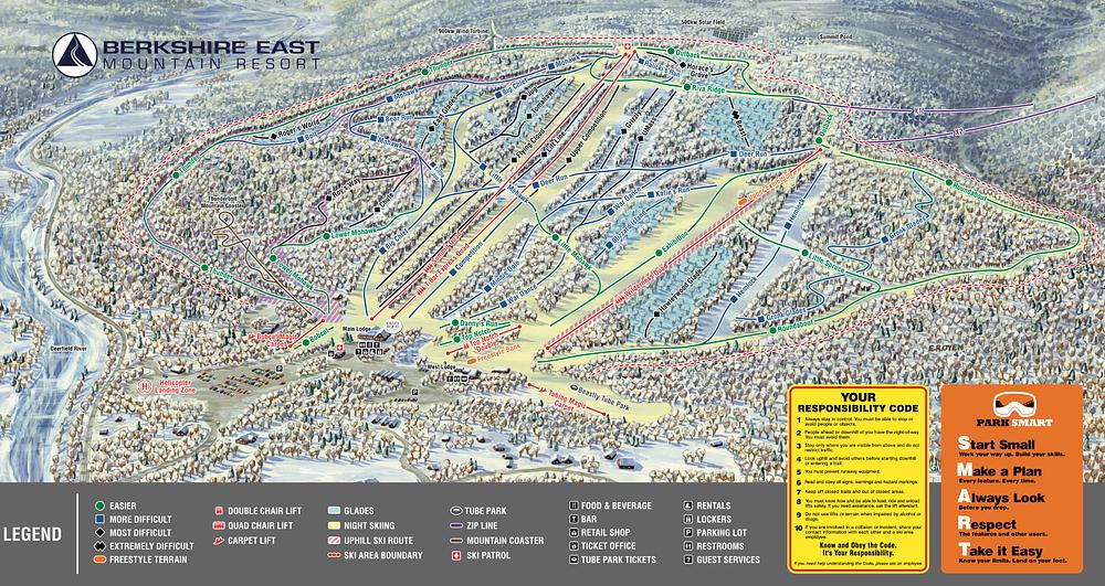 Berkshire East Mountain Resort is a four-season destination in the beautiful Berkshires of Western Massachusetts. With 42 trails, 4 aerial lifts, and 2 surface lifts, it offers a range of skiing and snowboarding opportunities for all skill levels. In the summer, visitors can enjoy mountain biking, zip line canopy tours, and an aerial adventure park. The resort also features a mountain coaster, a restaurant, and a variety of events and activities throughout the year.