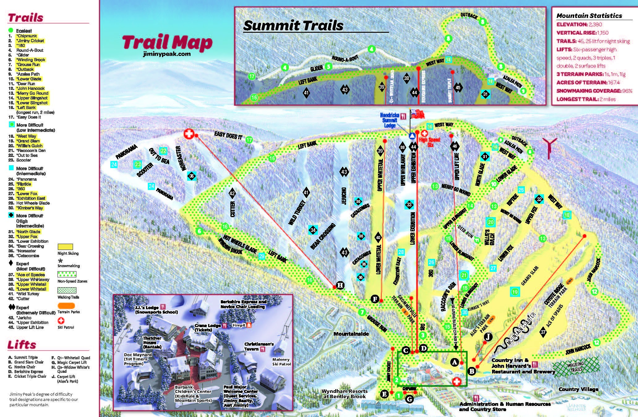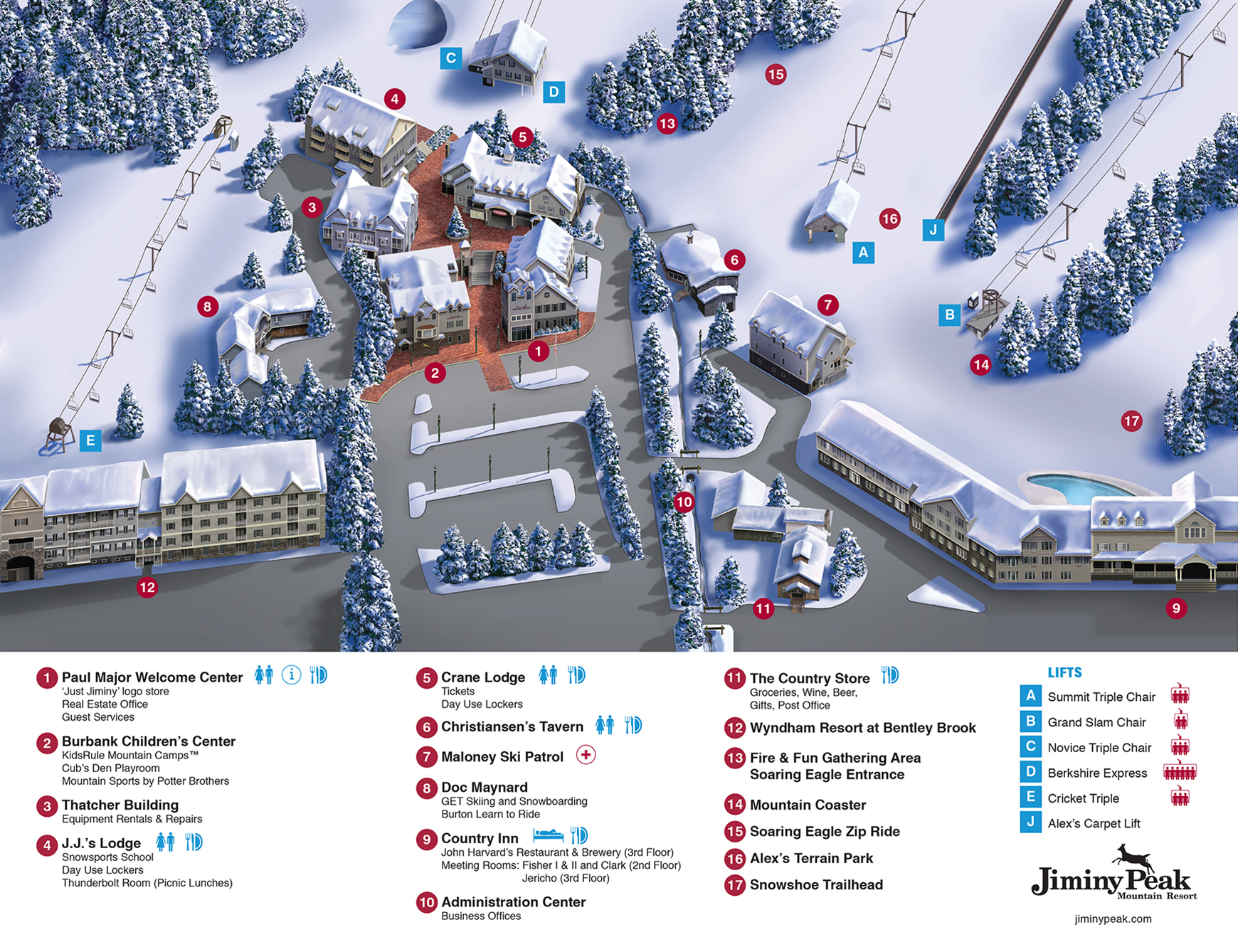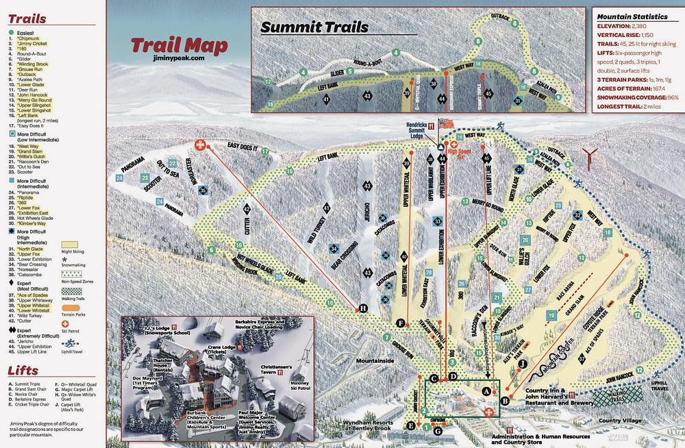 Jiminy Peak Mountain Resort is a premier four-season resort in Berkshire County, Massachusetts, offering a self-contained ski and snowboard experience with on-site accommodations, dining, and shopping. The resort boasts a mid-sized alpine ski area with varied terrain, snowmaking capabilities, and scenic chairlift rides. In the summer, visitors can enjoy the Mountain Adventure Park and Aerial Adventure Park. With a range of amenities, including an outdoor pool, business center, and free Wi-Fi, Jiminy Peak is an ideal destination for families and outdoor enthusiasts.