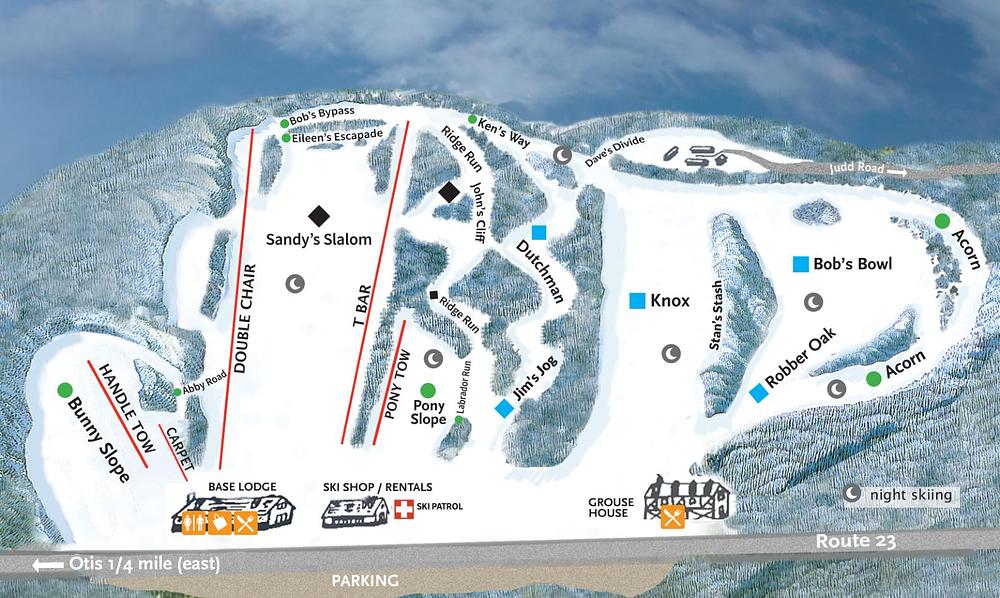 Otis Ridge is a family-friendly ski area in Otis, Massachusetts, offering 11 trails and a vertical drop of 400 feet. It has been in operation since 1947 and provides ski and snowboard lessons for beginners. The resort features a restaurant, night skiing, and a garden center. Otis Ridge is a great destination for families and beginners, with affordable ticket prices and friendly staff.