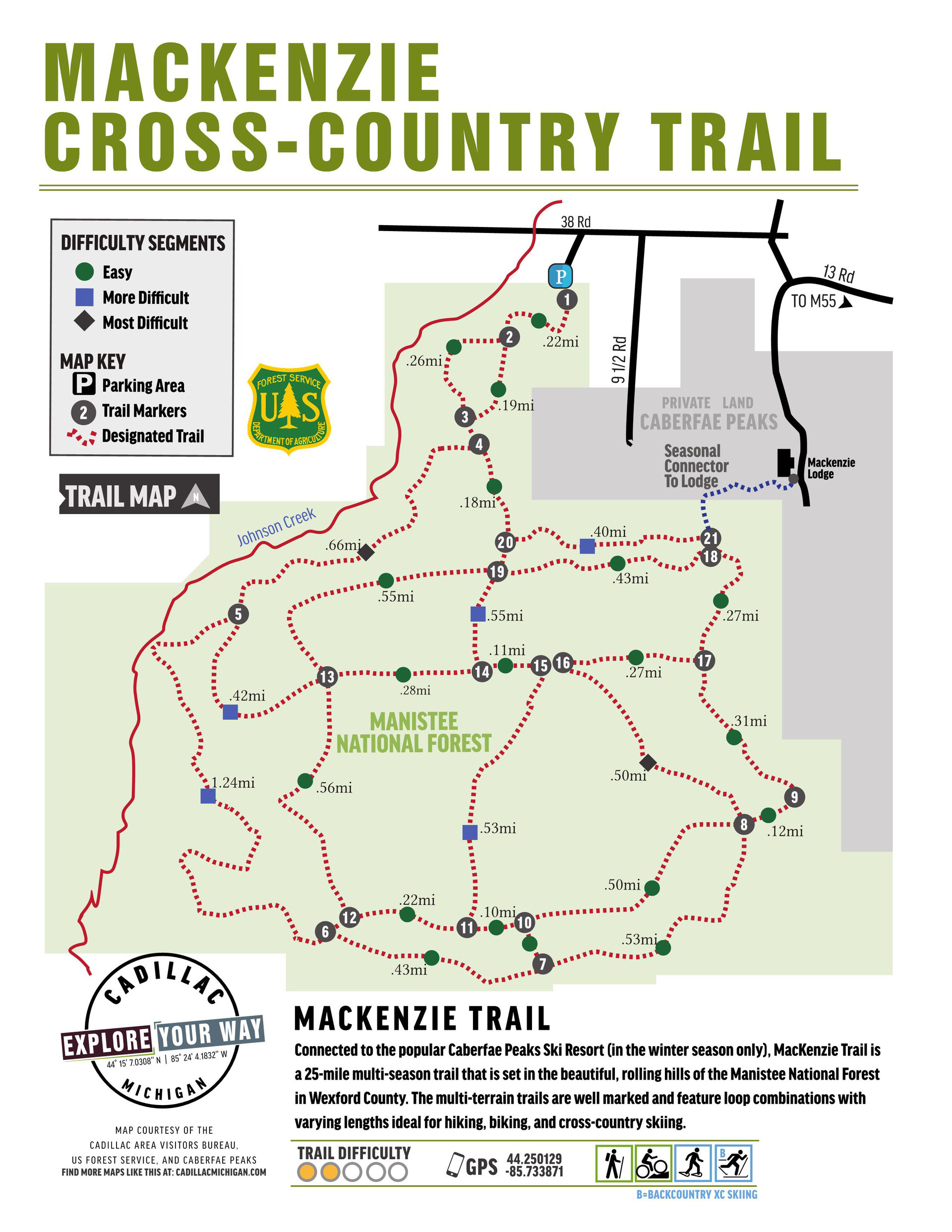 The Mackenzie Cross-Country Trail is a 10.1-mile trail in South Branch Township, Michigan, that offers loop combinations of varying lengths. Marked with blue diamond-shaped blazes, the trail is suitable for hiking, biking, and cross-country skiing. In the winter, it connects to the Caberfae Peaks Ski Resort. The trail is part of the Cadillac/Manistee Ranger District and is a multi-season trail that transitions from hiking and biking to skiing.