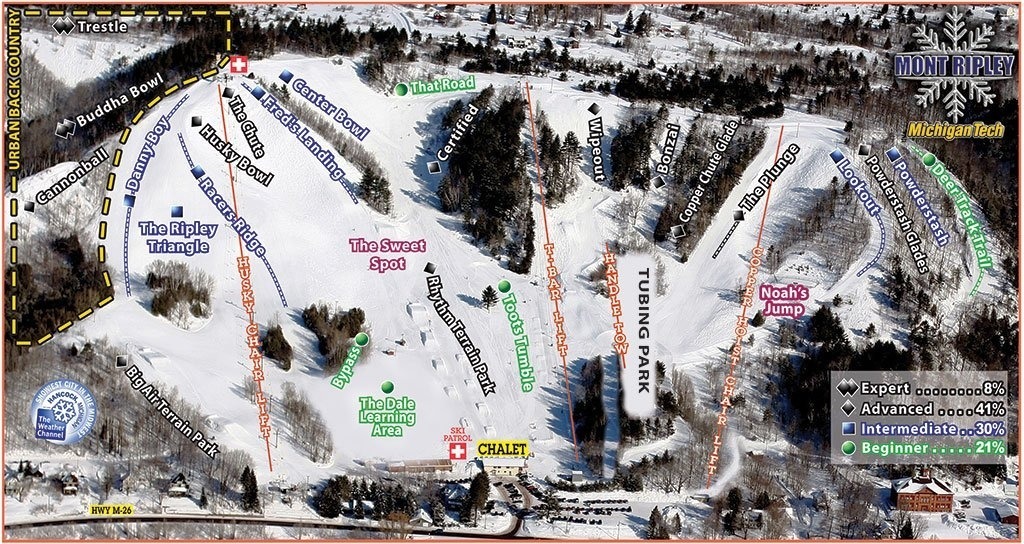 Mont Ripley Ski Hill is a ski resort located in Franklin Township, Michigan's Upper Peninsula, just outside the cities of Hancock and Houghton. It's owned by Michigan Technological University and features 24 trails, a terrain park, tubing park, and 112 acres of skiable terrain with a 440-foot vertical drop. Mont Ripley is Michigan's oldest ski resort, dating back to 1934, and offers a true alpine town experience with plenty of snow and well-groomed trails.