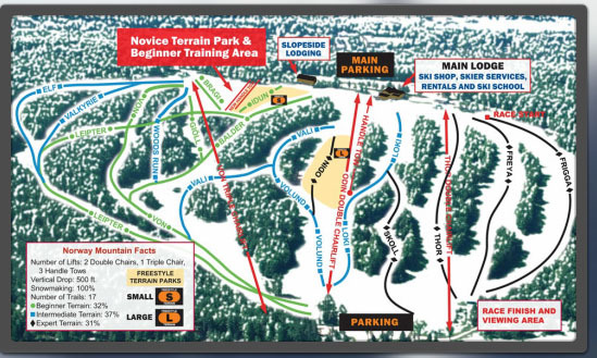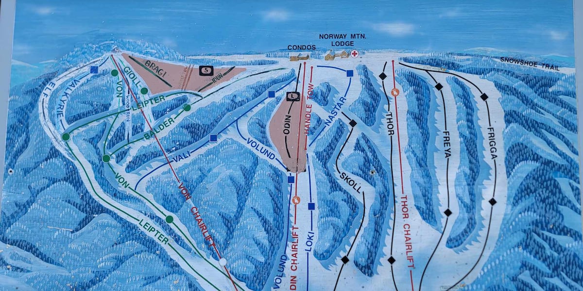 Norway Mountain Ski Resort in Norway, Michigan, offers a premier skiing experience with breathtaking views and diverse terrain. The resort features 17 trails across 186 acres of skiable terrain and 500 feet of vertical drop. After a two-year closure, the resort reopened in 2024 with improved snowmaking and grooming, as well as a new Summit Restaurant and Bar. The resort is nestled in the heart of the Western UP, just 2 miles from Wisconsin, and is a great destination for families and beginners.