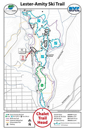 Lester-Amity Ski Trails in Duluth, Minnesota, offer 15 kilometers of groomed cross-country ski trails for both skate and classic skiing. The trails are mostly intermediate level and wind through pine, aspen, and birch forests. Four kilometers of the trail are lighted for early morning and evening skiing. The trail is easily accessible from East Superior Street and offers a variety of terrain for beginner to experienced skiers.
