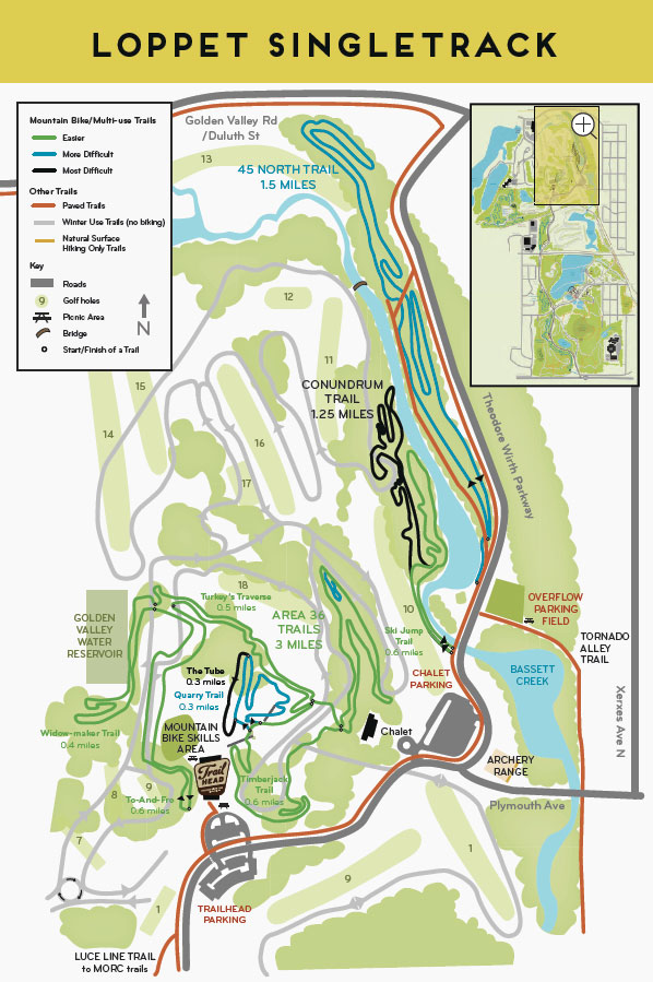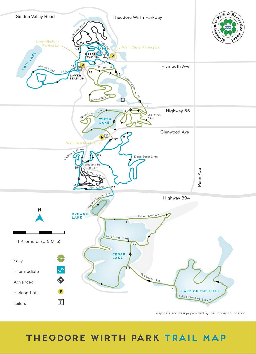 Theodore Wirth: Loppet Trails in Golden Valley, Minnesota, offers 23 km of groomed cross-country ski trails for beginner, intermediate, and advanced skiers. The trails are located in Theodore Wirth Regional Park and are maintained by The Loppet Foundation. The park also features mountain bike and multi-use trails, as well as a trailhead building with equipment rental and lessons. The Loppet Foundation offers winter programs and events, and the park is open from 6:00 a.m. to 10:00 p.m.