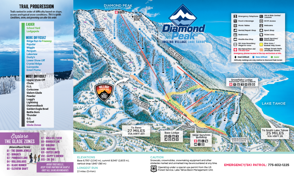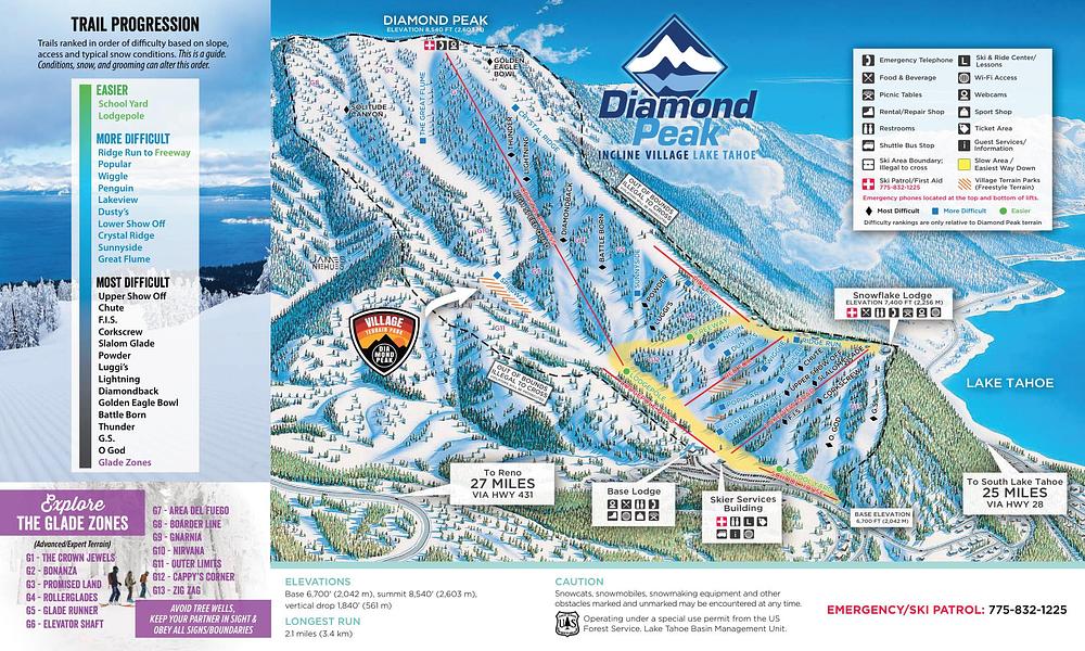 Diamond Peak Ski Resort in Incline Village, Nevada, is a hidden gem with breathtaking views of Lake Tahoe. It offers 27 runs, 14 open glades, and 655 acres of skiable terrain, with 6 chairlifts and 1 surface lift. The resort has a vertical drop of 1,840 feet and a longest run of 2.5 miles. With a medium size and uncrowded slopes, Diamond Peak is ideal for skiing, snowboarding, sledding, and a kids' zone. However, it has limited parking and resort prices for food.