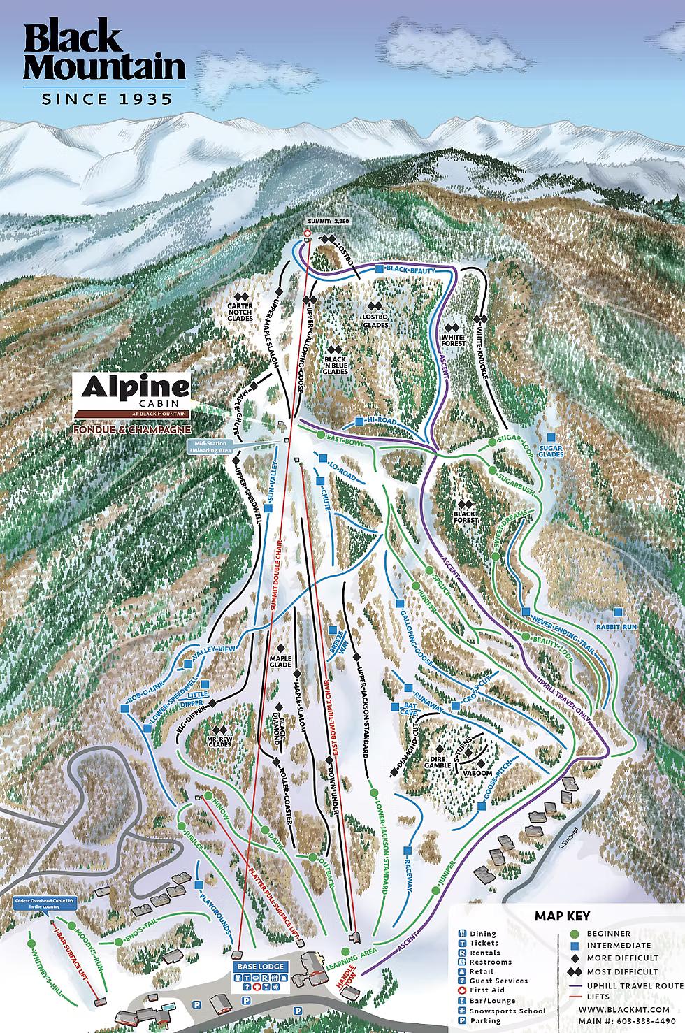 Black Mountain in Jackson, New Hampshire, is a family-friendly alpine ski area with 45 trails, a vertical drop of 1,100 feet, and a lift system consisting of 2 chairs, 2 surface lifts, and 1 rope tow. It offers skiing and riding for all ages and abilities, with slopes for novices, intermediates, and black diamond trails. The resort has a rustic charm and is known for its affordability and minimal lift lines, making it a great option for families and beginners.
