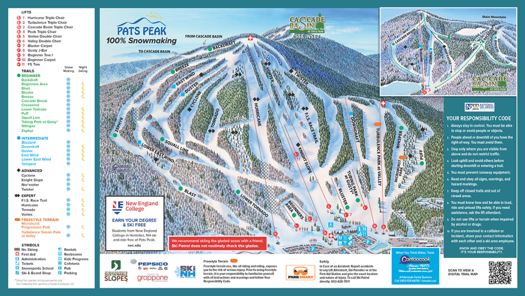 Pats Peak is a family-friendly ski resort in Henniker, New Hampshire, offering 26 diverse trails, three terrain parks, and night skiing. The resort features a 770-foot vertical drop, 28 trails, and a 1,460-foot summit. With a variety of dining options, including the Sled Pub, and a snow tubing park, Pats Peak is an ideal destination for skiers and snowboarders of all levels. Its accessible location, just a 90-minute drive from Boston, makes it a popular choice for those in the Northeast.