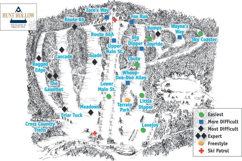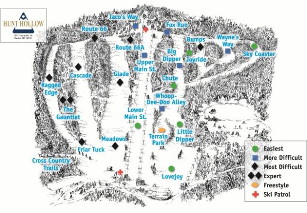 Hunt Hollow Ski Club is a premier private ski and snowboard resort located in Naples, New York, within the Finger Lakes region. The resort offers 400 acres of accessible winter recreation space, with a 825-foot vertical drop and 19 trails. It features a cozy lodge atmosphere, equipment rentals, and outdoor grills for cooking. The club is open to the public on weekdays, while weekends are reserved for members.