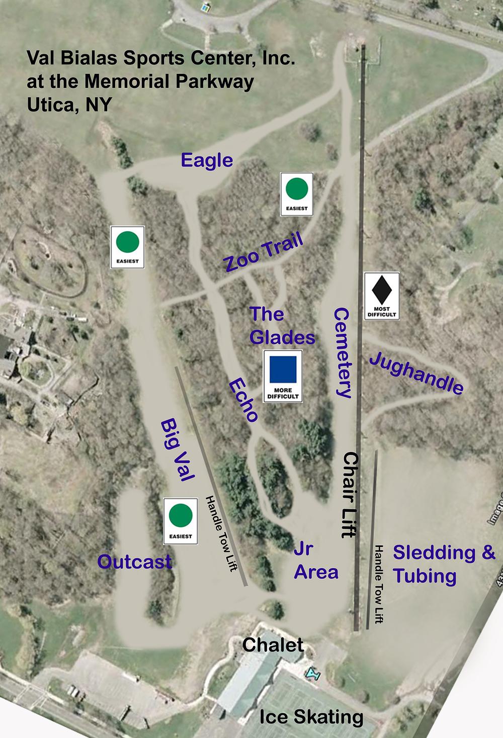Val Bialas Ski Center is a small ski resort located in Utica, New York, with 250 feet of vertical and three trails. It offers skiing, snow tubing, and sledding, with a 400-foot hill and lights for evening skiing. Lift tickets are $10 per person, and only cash is accepted. The resort has struggled with chairlift issues and a lack of snow, but has received funding for a new chairlift and snow-making equipment.