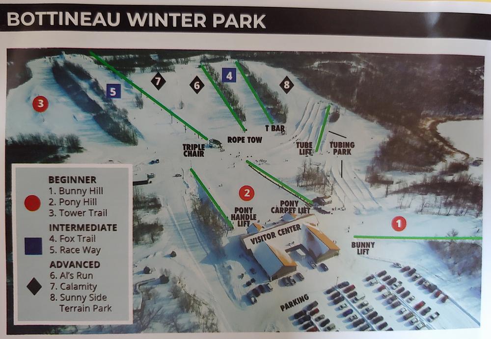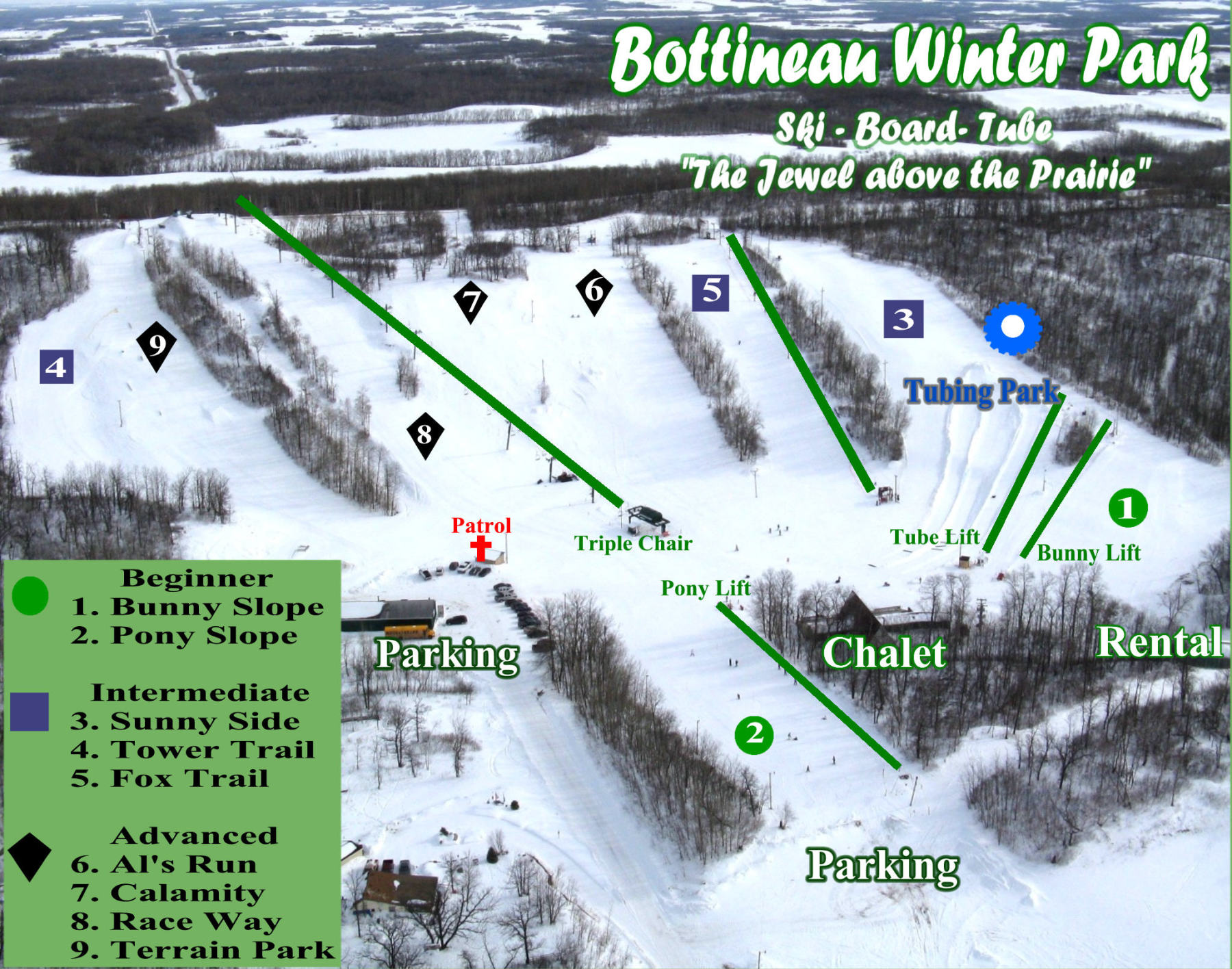 Bottineau Winter Park is a family-friendly ski resort located in the Turtle Mountains of North Dakota. It features downhill skiing, snowboarding, snow tubing, and snowshoeing for all ages and abilities. The resort has 1.2 km of slopes, 4 lifts, and a vertical drop of 180 feet. Night skiing is available Thursday and Friday until 9 pm. Rentals, a terrain park, and a tubing hill are also available. The resort is known for its friendly staff and affordable prices, with lift tickets and rentals available for purchase online.