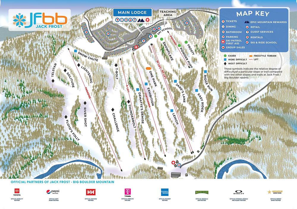 Jack Frost Mountain Ski Area, located in Kidder Township, Pennsylvania, offers a variety of terrain for all skill levels with 20 trails and 12 lifts. The resort features two separate ski areas, Jack Frost and Big Boulder, with a combined vertical drop of 475-600 feet. With a range of beginner to black diamond trails, Jack Frost is a great destination for families and experienced skiers alike. The resort also offers snow tubing, hotels, shops, and restaurants.