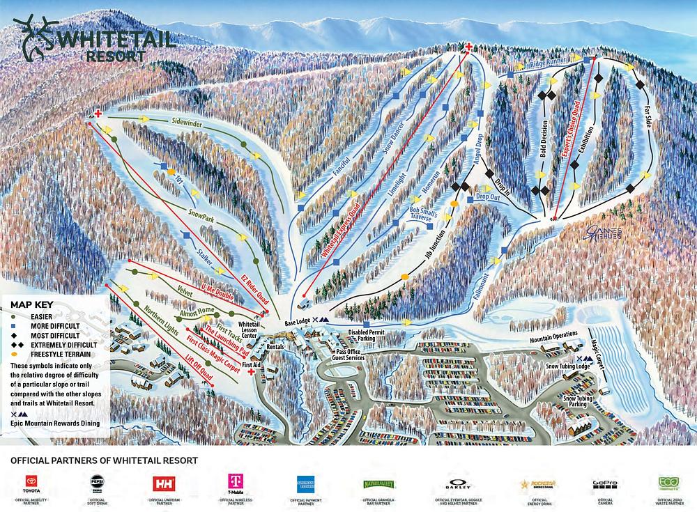 Whitetail Resort is a four-season resort located on Two Top Mountain in Pennsylvania, offering skiing, snowboarding, and summer activities. The resort features 23 trails, a 935-foot vertical drop, and a halfpipe. With 9 lifts, including a high-speed quad chair, and a terrain park, Whitetail provides a variety of skiing and snowboarding experiences. The resort also offers a golf course, restaurants, and lodging options. It's a popular destination for both locals and visitors, with a skiable area of 109 acres and a lift capacity of 12,200 skiers per hour.