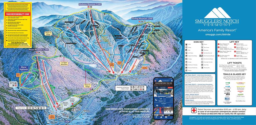 Smugglers' Notch Resort is a year-round mountain vacation resort in Jeffersonville, Vermont, offering a variety of activities and amenities for families. With over 60 trails and 8 lifts, the resort is a top ski destination in the East, voted #1 overall ski resort in the East. In addition to skiing and snowboarding, Smugglers' Notch offers snow tubing, snowshoeing, and cross-country skiing, as well as a range of summer activities like hiking, mountain biking, and zip lining. The resort features a variety of accommodations, including condos and hotel rooms, and offers a range of amenities, including an indoor and outdoor pool, free Wi-Fi, and a fitness center.