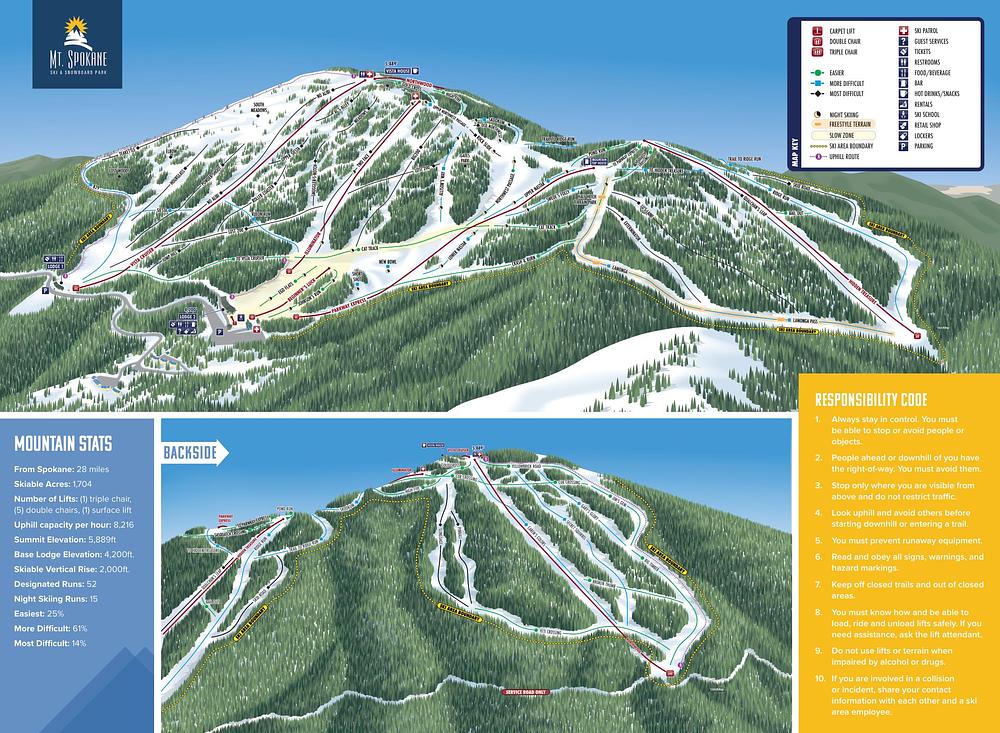 Mt. Spokane is a ski resort located at the top of Mount Spokane in Washington State, USA. It offers 1,700+ acres of skiable terrain, 52 designated runs, and 6 chairlifts, making it the region's only non-profit 501(c)(3) ski area. The resort features night skiing on Wednesdays and Saturdays, with day tickets including night skiing. It's a popular destination for winter sports enthusiasts, with two day lodges and a variety of dining options.