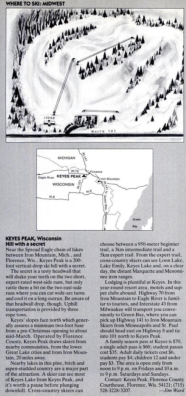 Keyes Peak Ski Area is a county-owned and operated ski resort in Florence County, Wisconsin. It offers downhill skiing, snow tubing, snowshoeing, and cross-country skiing opportunities. The area also features panoramic views from its highest elevation, making it a popular destination for outdoor enthusiasts year-round. With a large indoor area and rentals available, Keyes Peak is a great spot for families and those looking to enjoy the beauty of the Wisconsin wilderness.