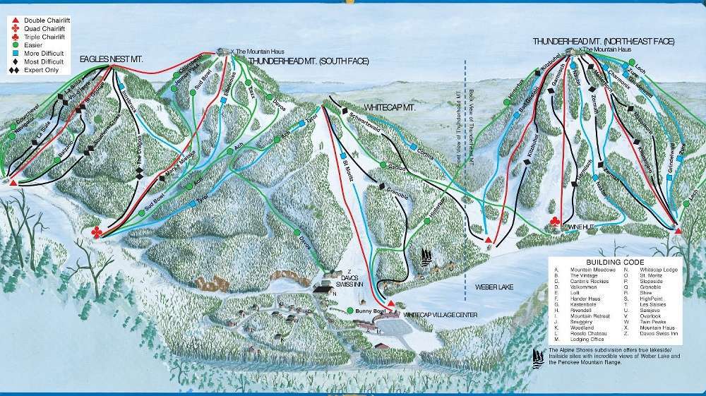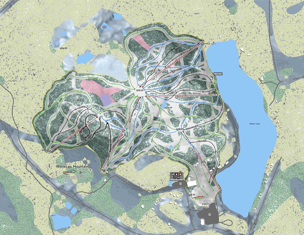 Whitecap Mountain is a 4-season resort located in the town of Upson, Iron County, Wisconsin. It features 43 ski trails with a 400-foot vertical drop, as well as hiking, ATV, and other outdoor activities. The resort offers lodging options, including lodge rooms, condos, and chalet-style cabins, and has a golf course. Whitecap Mountain has a reputation for having "always fresh powder" and excellent staff and service. The resort has undergone a rebuild after a fire in 2019 and continues to offer a range of amenities, including an indoor pool and business center.